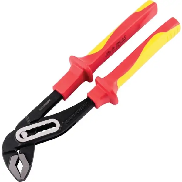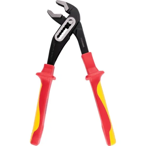 Insulated water pump pliers have an adjustable, multi-position joint that provides a secure grip on pipes, nuts and fittings of various sizes, overall length 250 mm, safe for use in electrical applications up to 1000 V. VDE