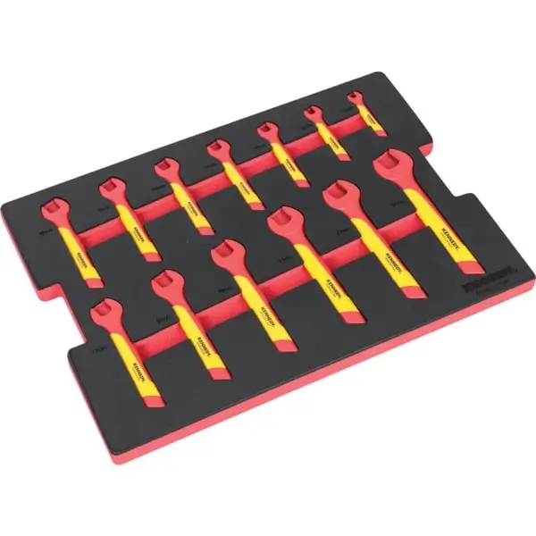 Insulated tool set includes 13 pieces for safe working on live circuits up to 1000 V. It consists of assorted open-end wrenches size 8-24 mm, which are stored in a precision-cut foam inlay. The set is VDE-approved
