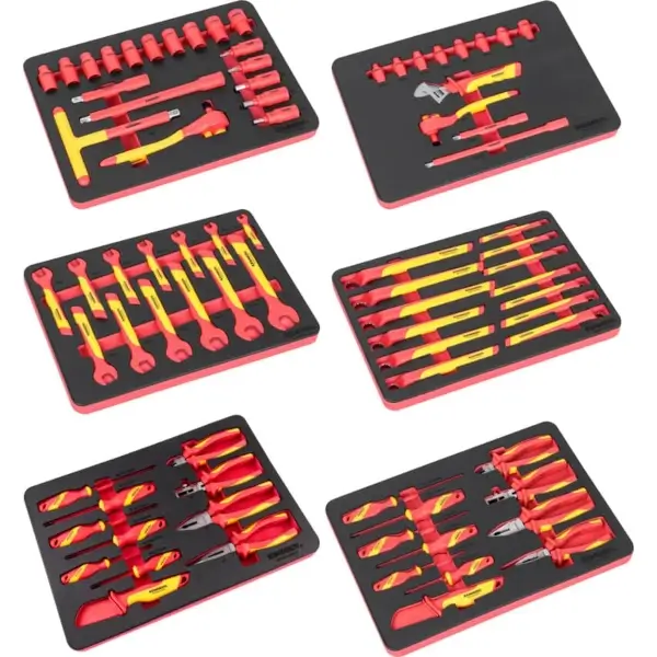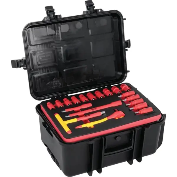Insulated tool set includes 68 pieces, including screwdrivers, wrenches, sockets and pliers. It is ideal for handling a wide range of electrical tasks, tools are organised and protected in a waterproof, impact-resistant case VDE-approved.