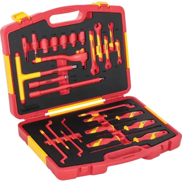 Insulated tool set includes 27 pieces, including screwdrivers, wrenches, sockets and pliers, and is ideal for handling a wide range of electrical tasks, tools are organised and protected in an impact-resistant carry case VDE-approved.