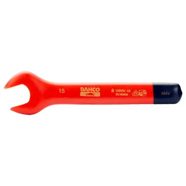 开口扳手,采用高性能合金钢制造,浸涂绝缘层,适用于1000伏带电设备操作,经10000伏10秒测试,长度157毫米,尺寸16毫米,符合VDE标准